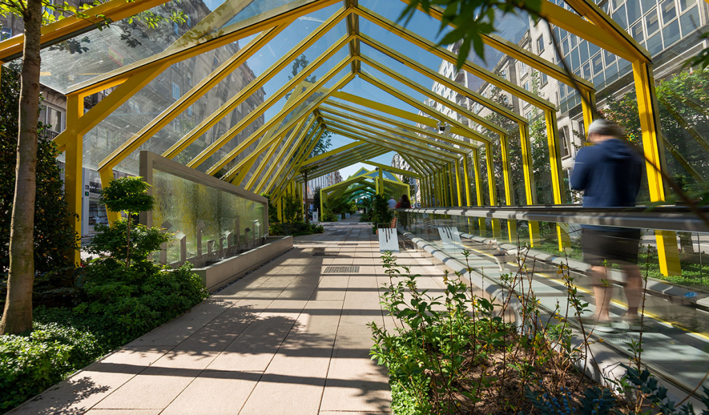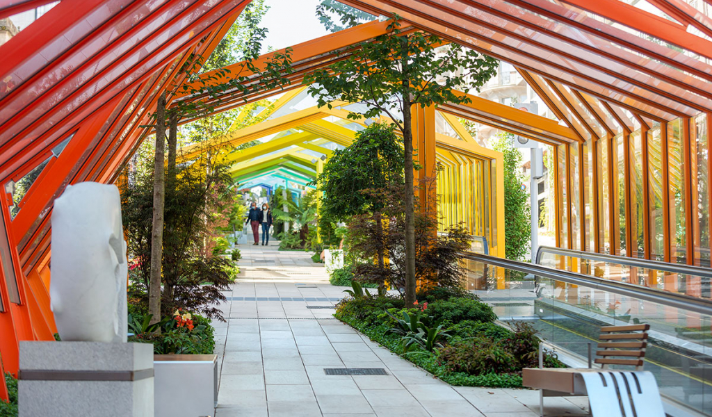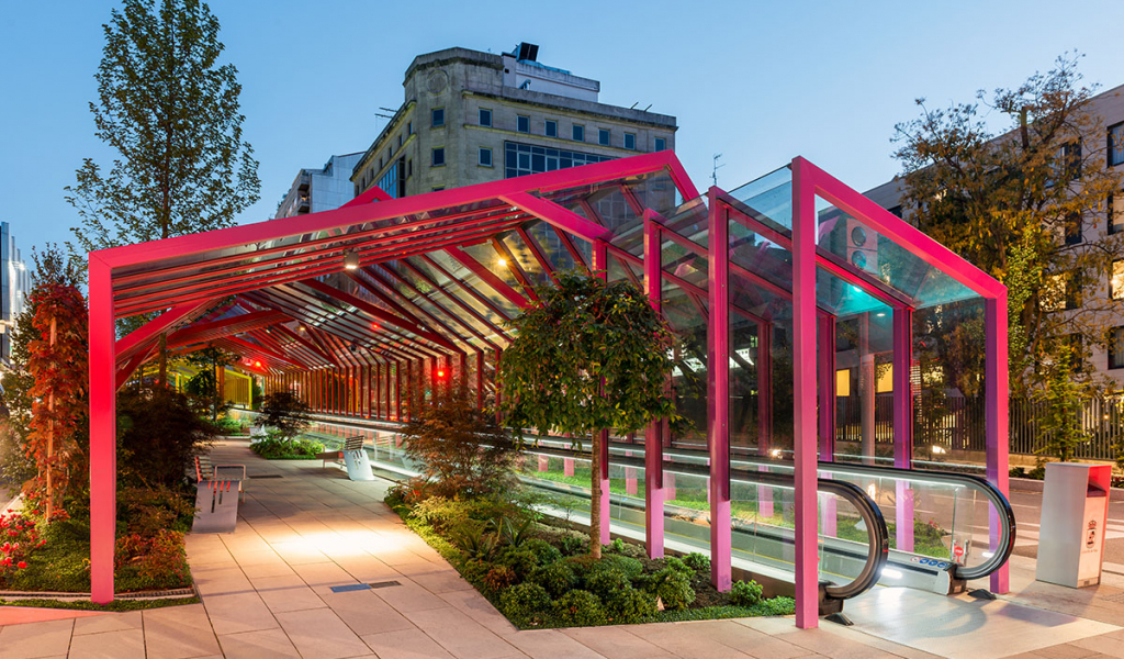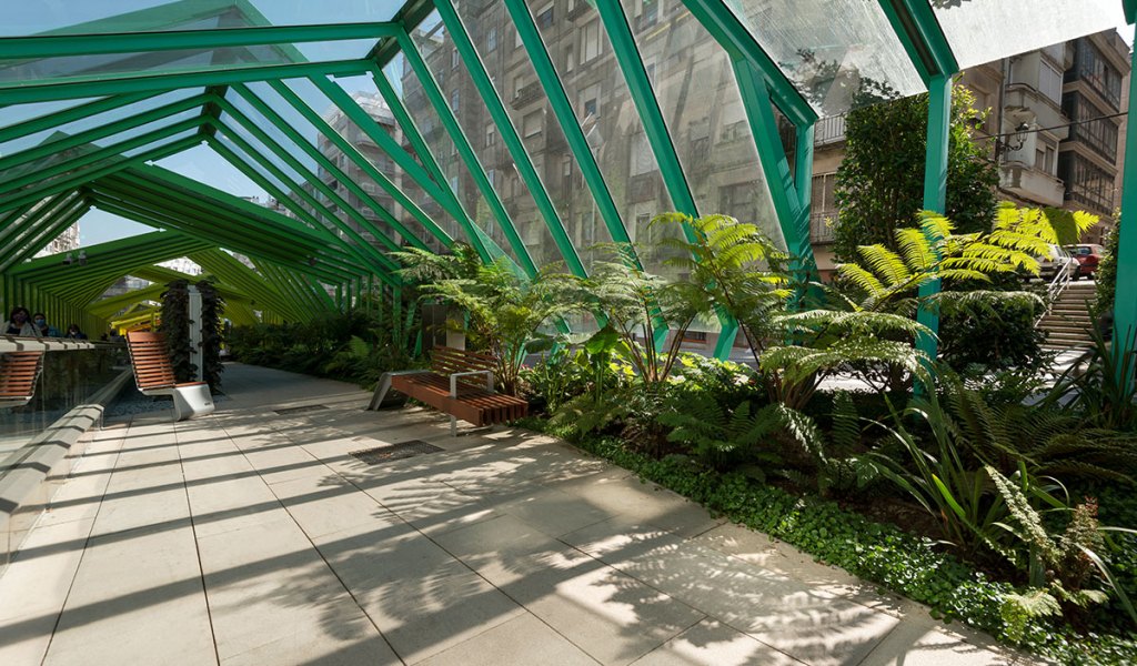 En el bulevar se distinguen 2 isletas, en cada una de las cuales se incluye algún elemento que caracteriza y singulariza cada ámbito. A través del mobiliario, del arbolado, la cubierta de estructura metálica y el pavimento, se produce una unificación de toda la actuación. En las zonas donde se localizan los andenes, se dispone una cubierta a dos aguas mediante una estructura metálica. Ambas isletas cuentan con abundante vegetación que caracteriza cada espacio.