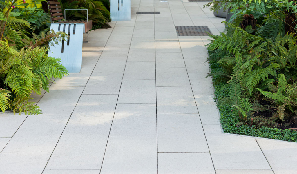 Para este proyecto se han elegido Losa Gran Formato Modern de Quadro en medidas 120x40x12cm que refuerzan el diseño longitudinal del proyecto aportando porfundidad y perspectiva. Además, la elección del Acabado Pepper en color Hueso de nuestro catálogo permite percibir el pavimento como una superficie ligera y de aspecto moderno en línea con el diseño de todo el conjunto.